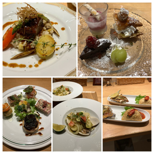 アミューズ、前菜1前菜2、パスタ料理、魚料理